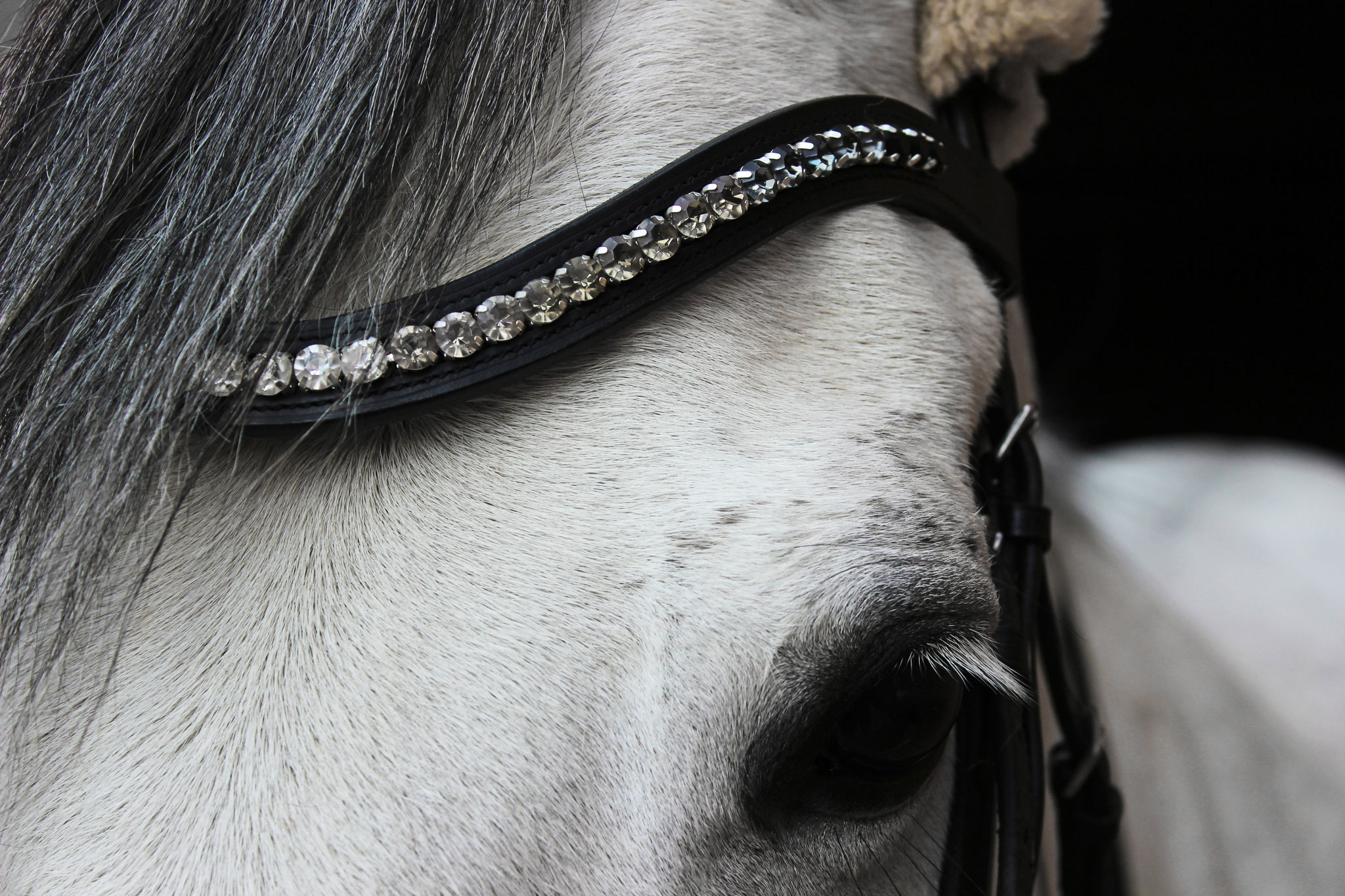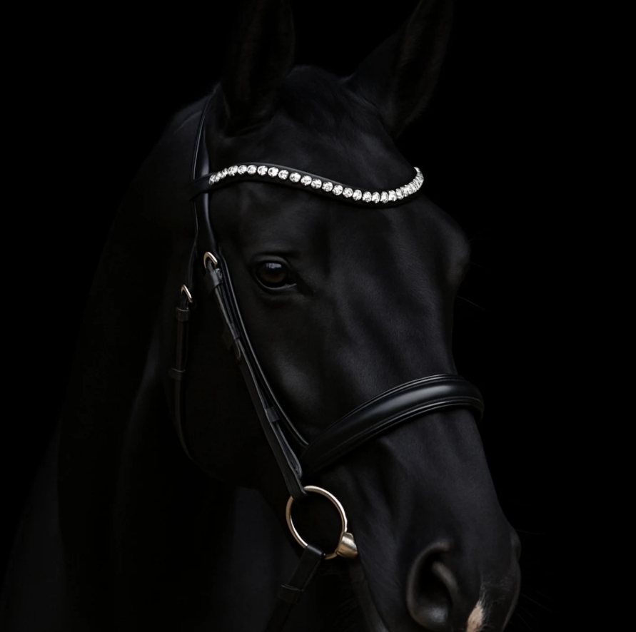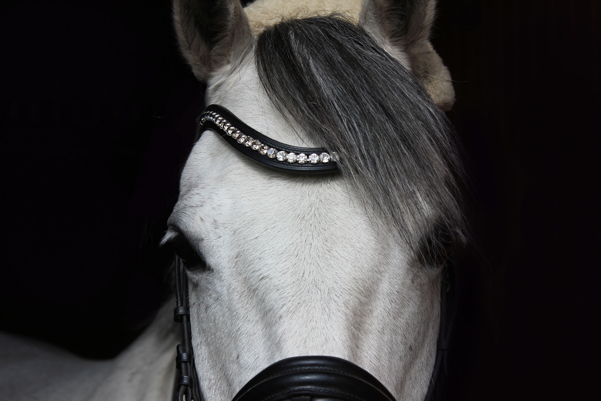NEU im Shop erhältlich! Halfter "GLAMOUR" mit kleinsten Strasssteinen an Backen- und Nasenriemen, sowie Stirnriemen "SPARKLE" mit Druckknopf und Flat Strasssteinen.